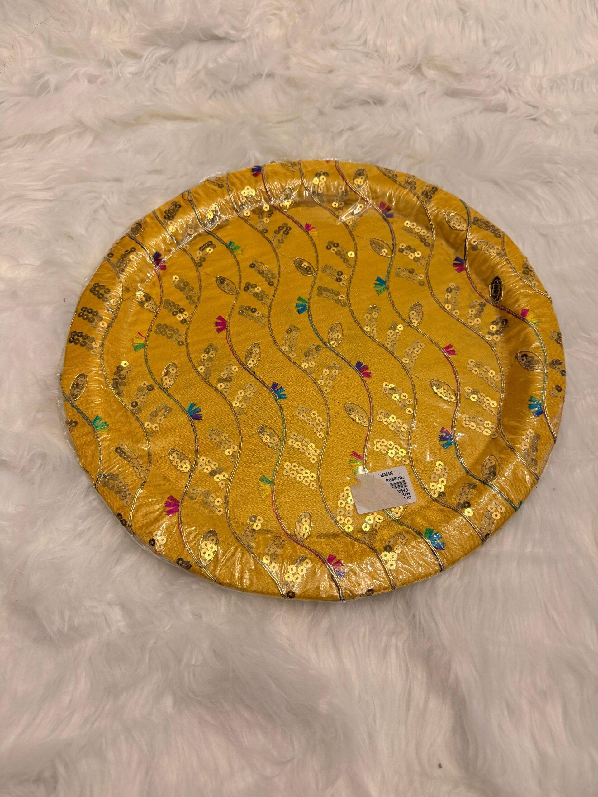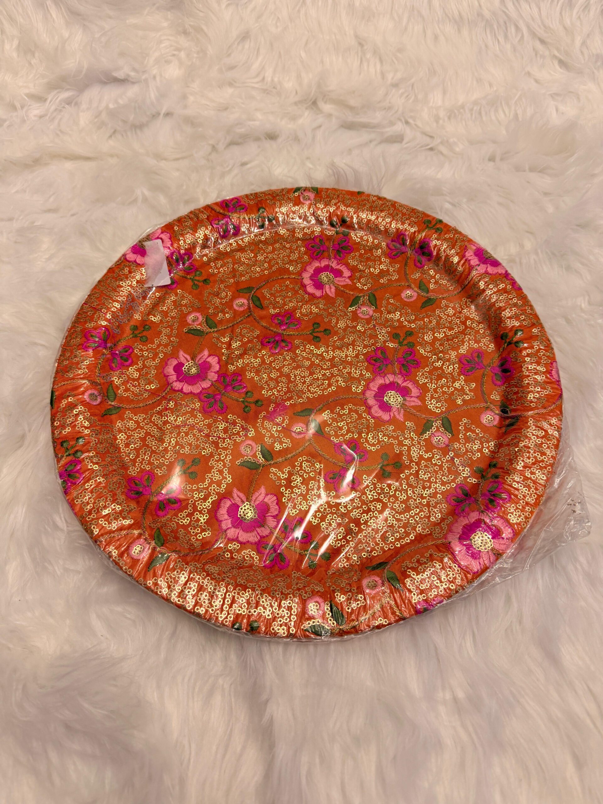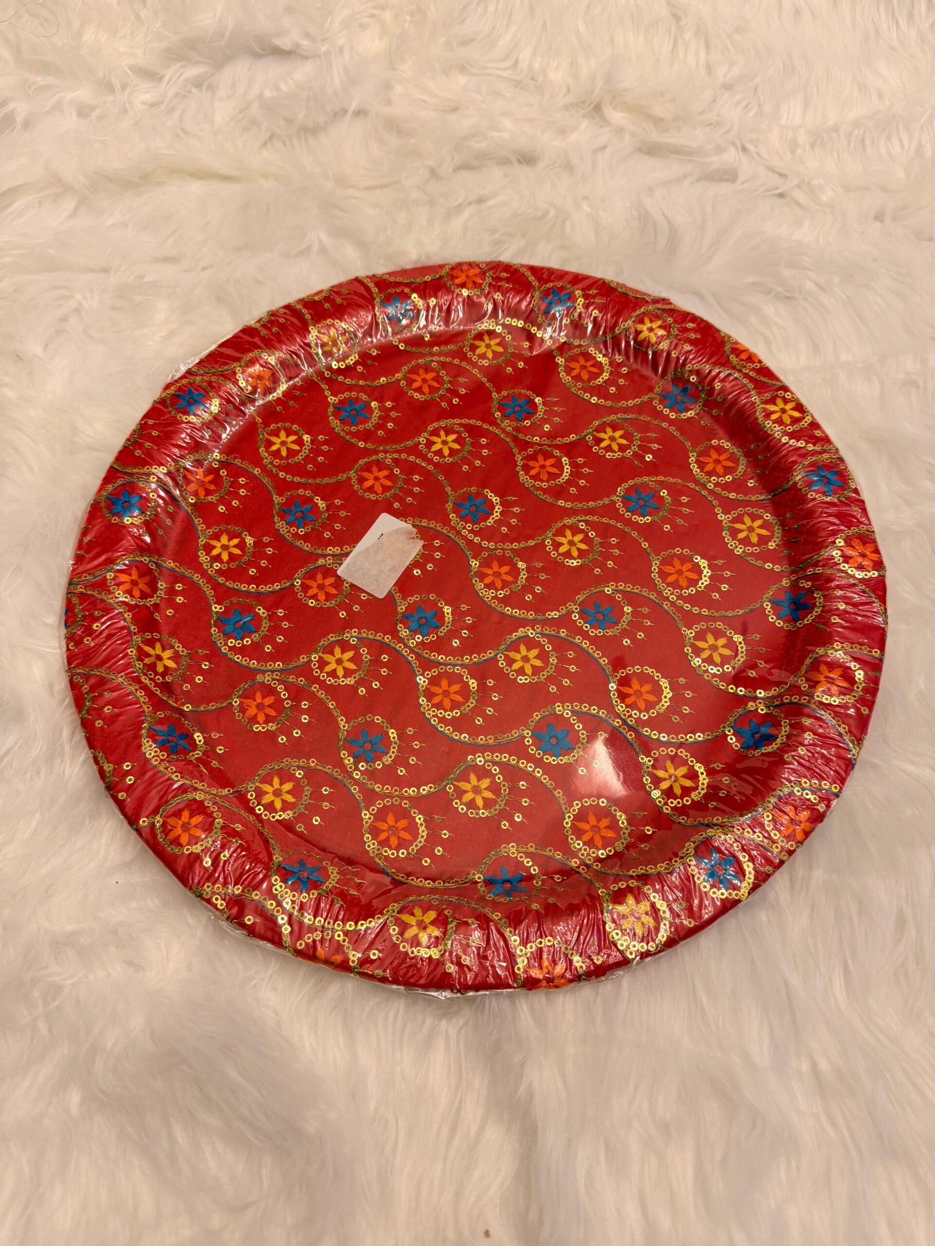 Decorative round thaals perfect for celebrating mehndi, manjha, and mayoun. Ideal for packing mithai, fruits, bangles, jewelry, and bride–groom outfits.($54 each)